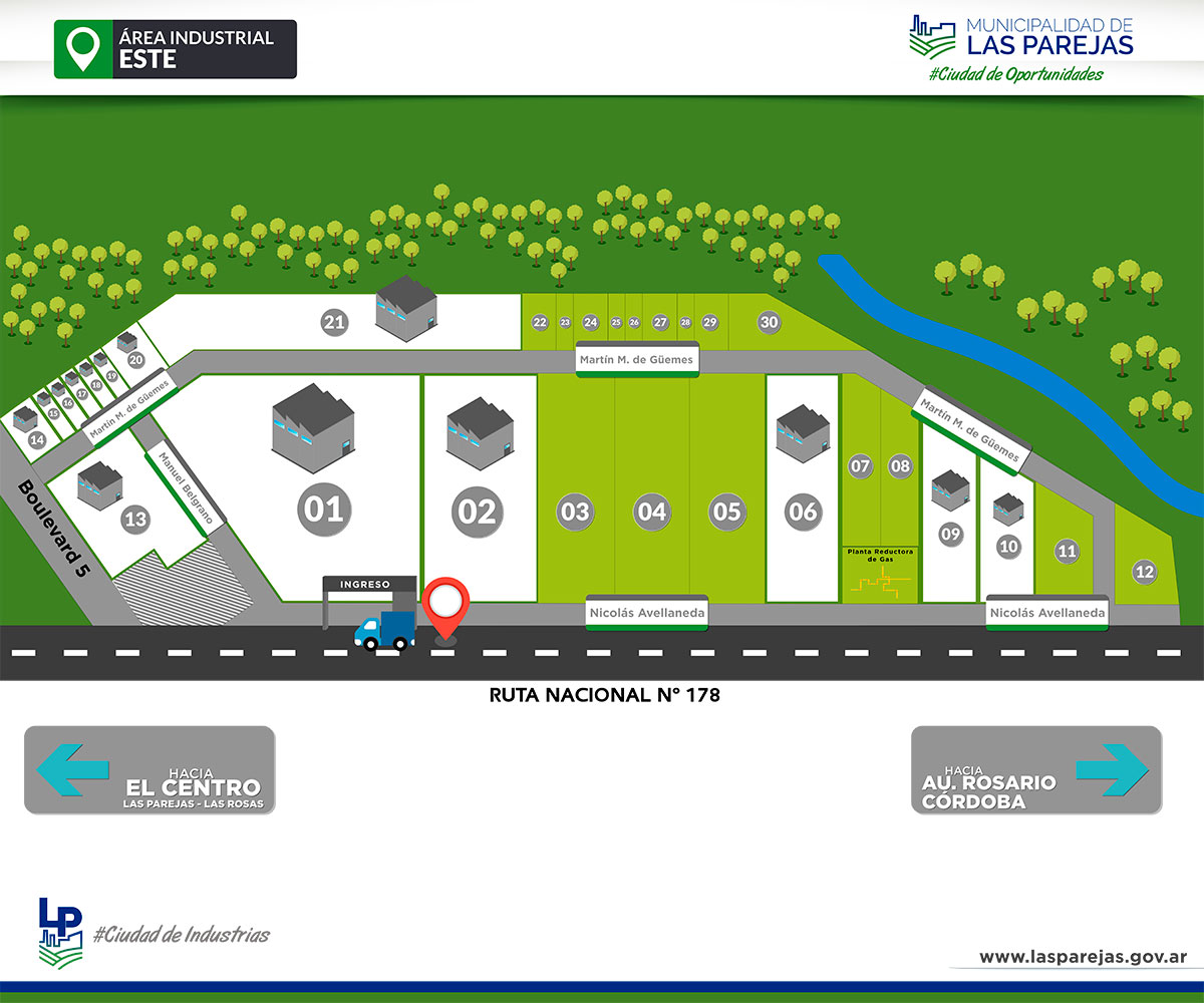 Las Parejas cuenta con un Área Industrial Municipal, con 200 lotes vendidos, donde funcionan más de 110 empresas industriales.