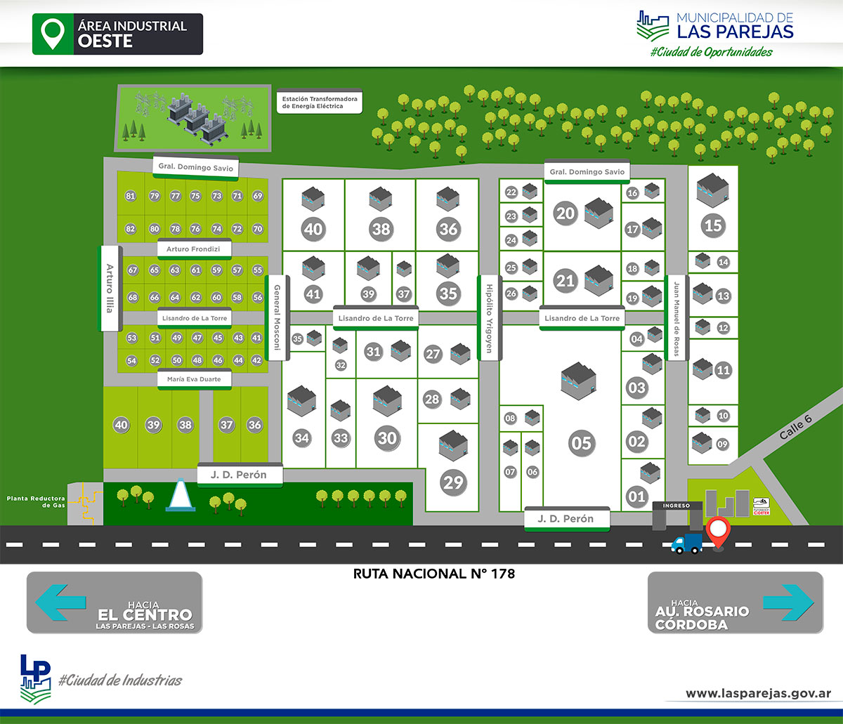 Las Parejas cuenta con un Área Industrial Municipal, con 200 lotes vendidos, donde funcionan más de 110 empresas industriales.